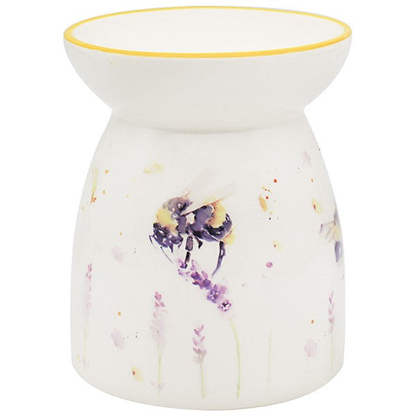 A white ceramic wax burner with a yellow lid, adorned with hand-painted multicolored flowers and bees on a country-themed design.