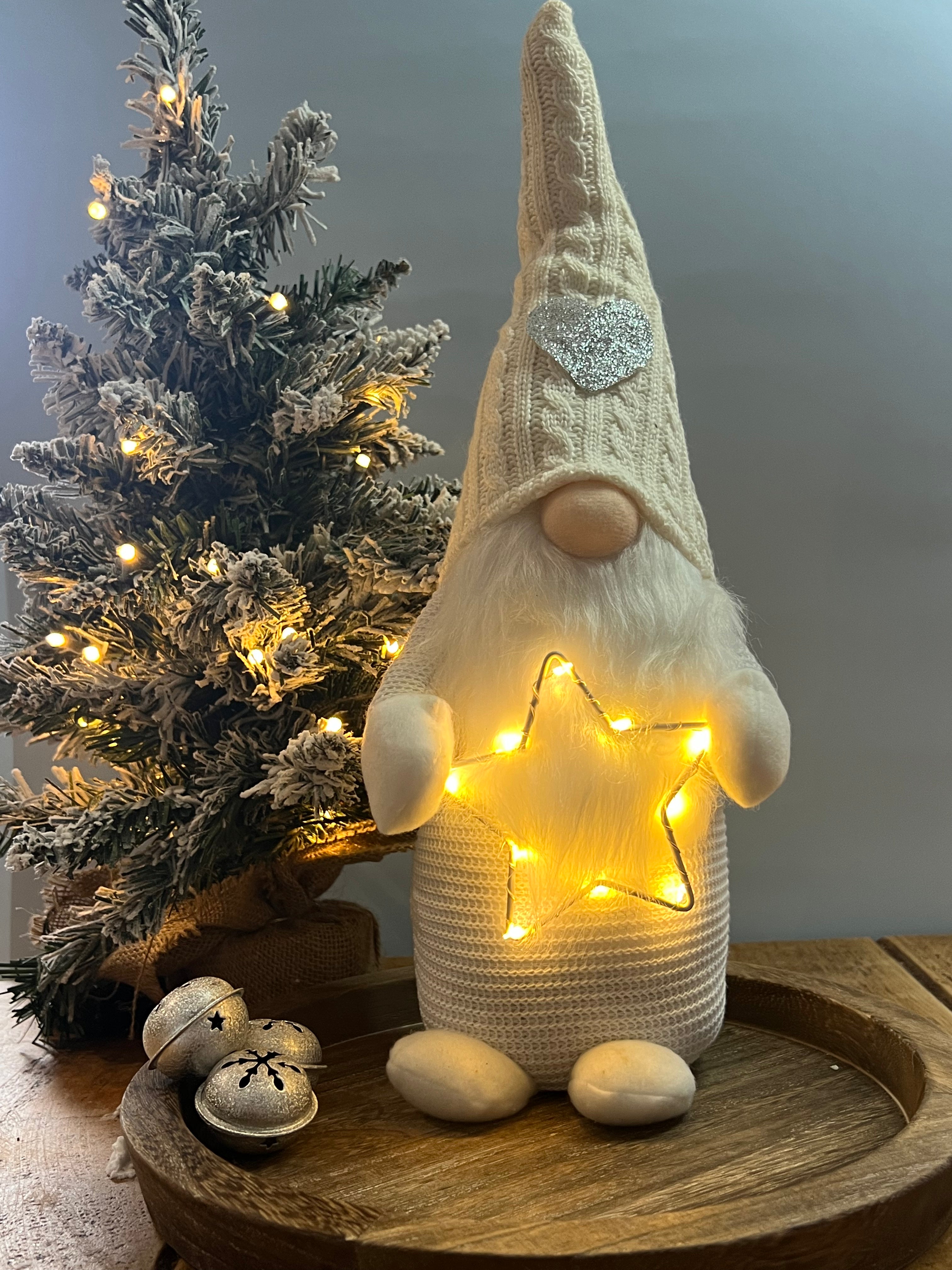 Add a touch of charm to your seasonal decor with our enchanting standing Gonk decoration, featuring a cozy knitted hat adorned with a sparkling silver heart. Holding an LED star that emits a warm, inviting glow when illuminated, this whimsical piece is sure to brighten up any space.