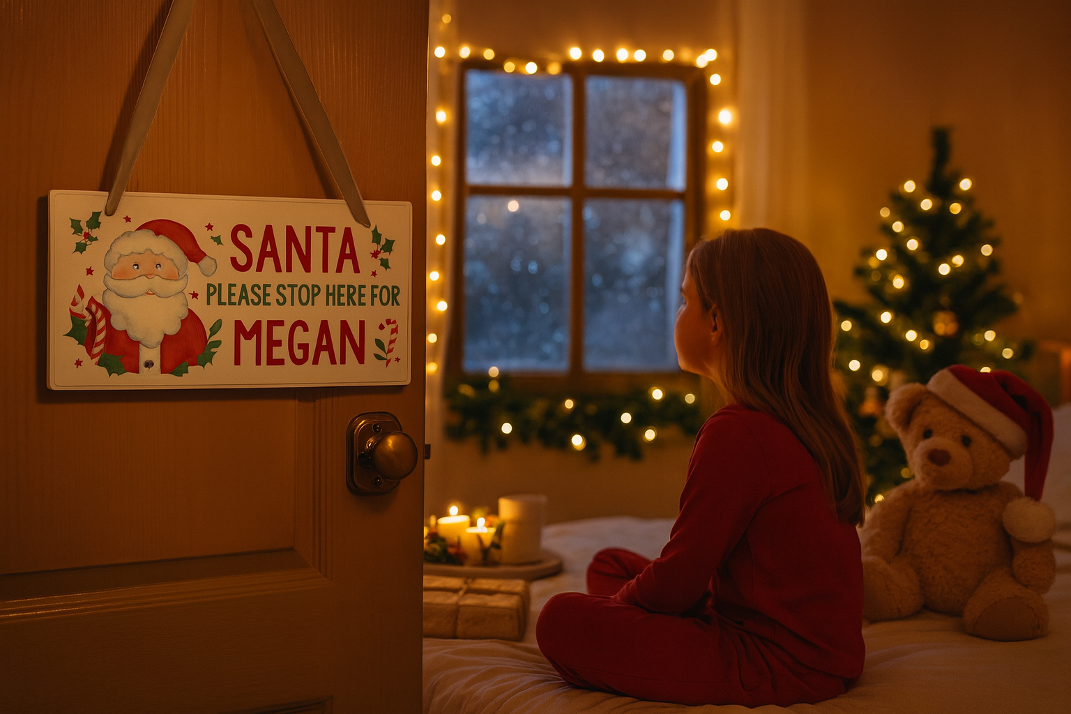 Personalise your sign with a name of your choice (up to 12 characters) for a unique, heartwarming finish. The fixed text “Santa please stop here for” adds a whimsical festive flair, while your child’s or family’s name completes the enchanting message.
