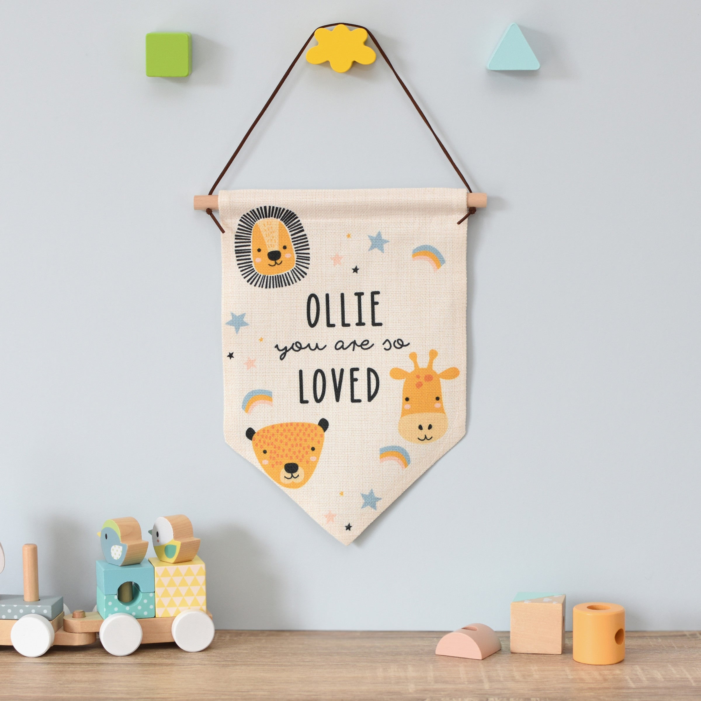 Introduce a touch of whimsical charm to any nursery or child's room with our adorable Personalised Scandi Safari Animals Hanging Banner. This sweet and stylish linen banner is a delightful addition that adds a personalised touch to your little one's space while spreading a heartwarming message of love and comfort.