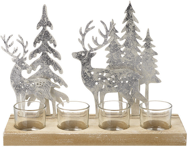 Elevate your home decor with our set of clear glass candle pots, elegantly presented in a wooden base adorned with a charming, rustic metal Woodland and Reindeer scene.
