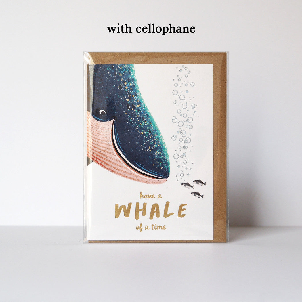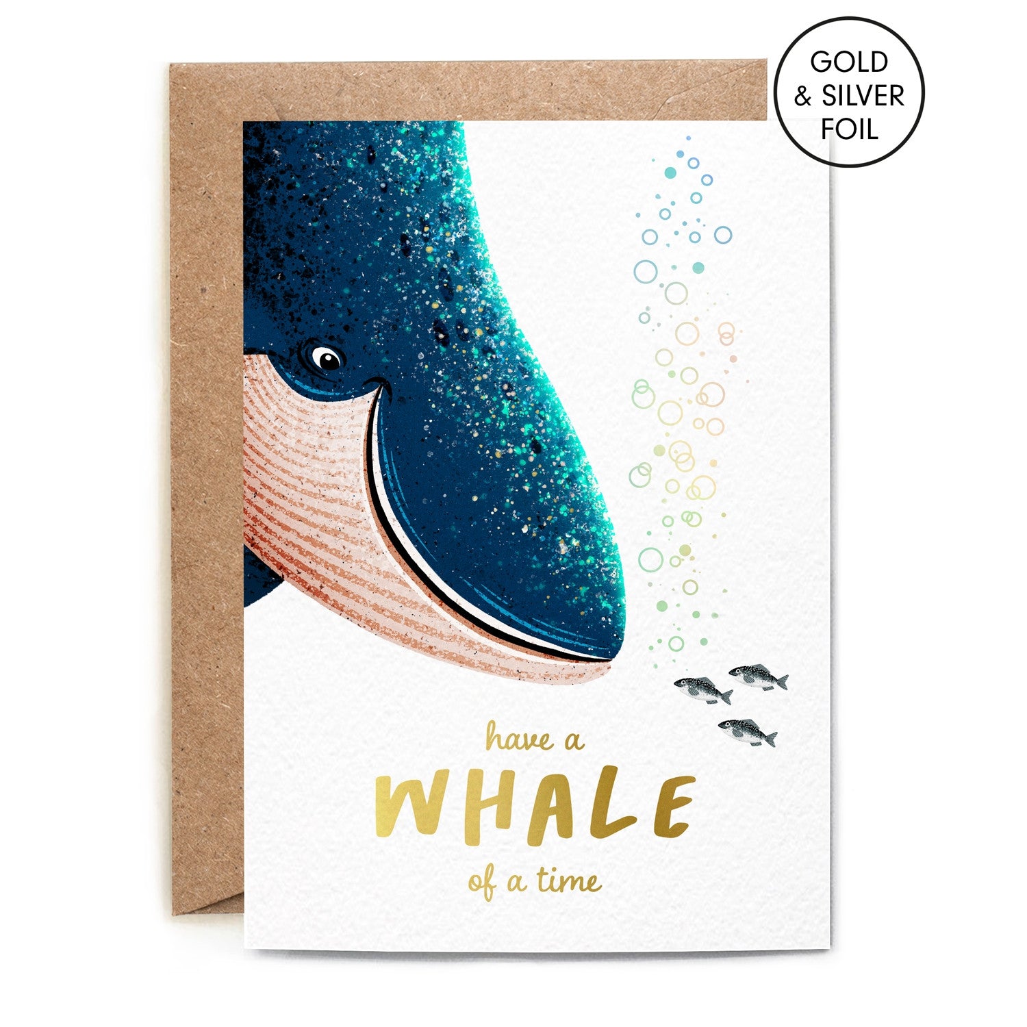 As the gold foil “Have a Whale of a Time” caption is generic and the inside of the greeting card is blank, it can be personalised for almost any occasion - perhaps even as a new job card or wedding card.