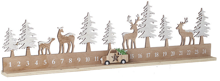 Brighten up your holiday decor with this charming natural wooden Christmas Countdown featuring a glittering snow-topped Woodland Scene and an adorable little car counter.